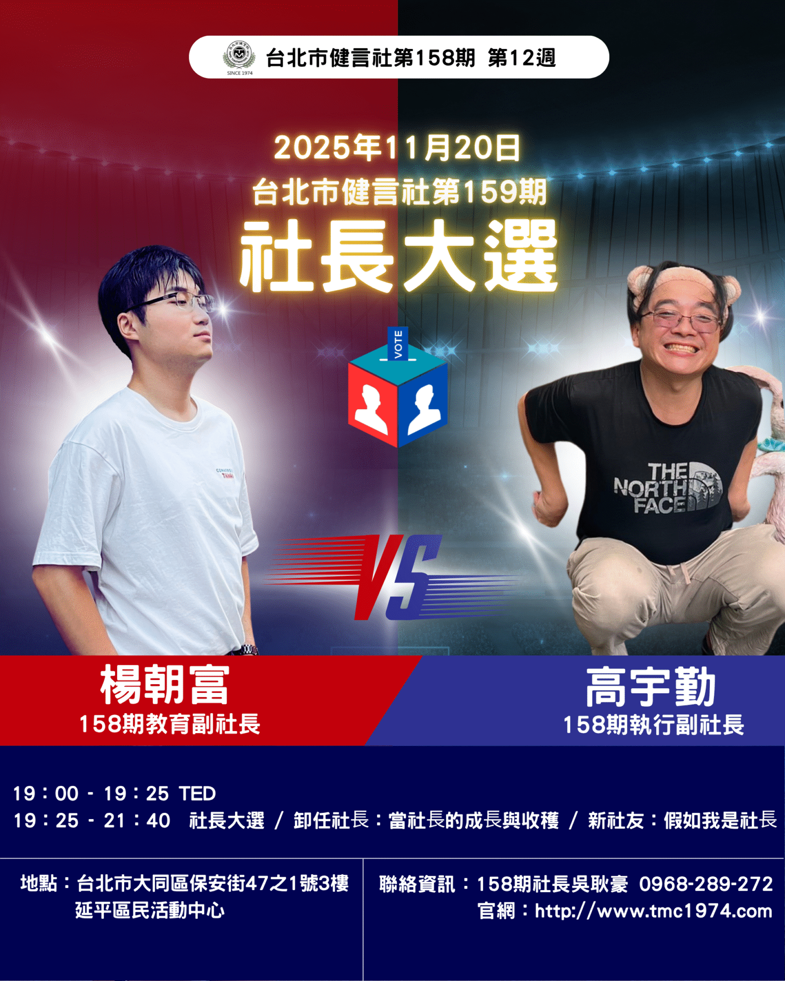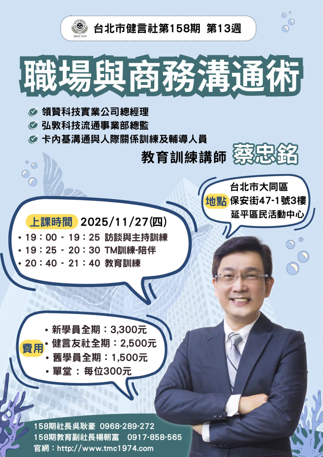 🌟 台北市健言社 第158期|第六週課程 🎤 TM 演講訓練主題|說話的藝術 ✨ 教育訓練主題|精準講評讚美力 「一句話」,可以成就一場演講。當講評者懂得用精準又真誠的讚美,一場平凡的表達,就能變成一 […]