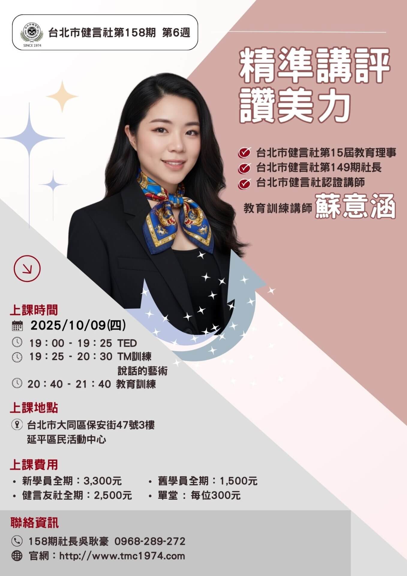 透過 TM 演講訓練,讓我們一起學會「如何讚美得有力量、建議得有方向」,讓每一次講評都能成為推動進步的起點。