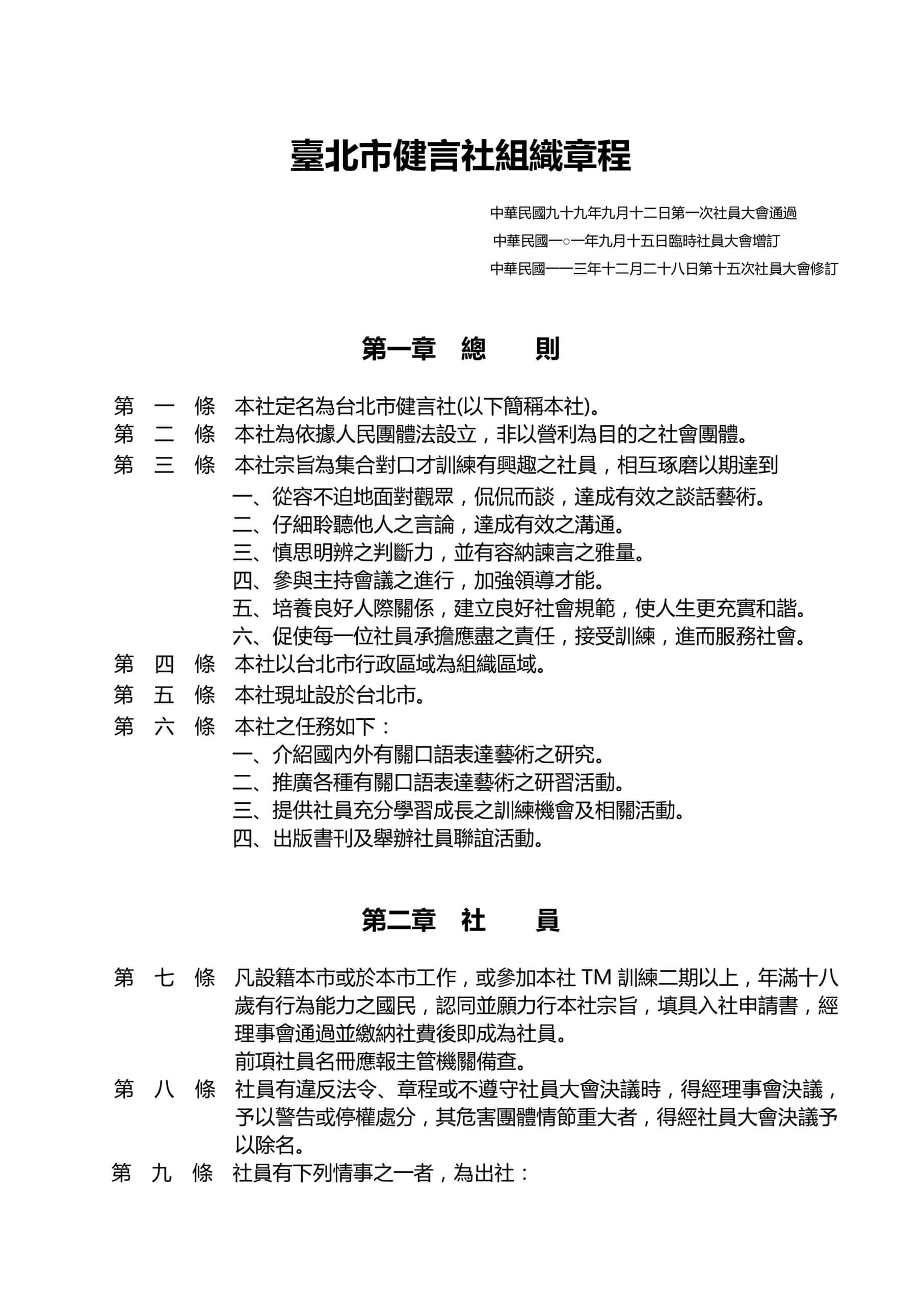 本社創立於西元1974年,以語言表達訓練、人際關係能力培養為宗旨,不論是公眾演講、聆聽溝通、判斷包容、領導才能、人際關係、擔當回饋各個部分,都可以在社團良好的傳承下改善及提升,活動內容邀請各大社團講師擔任總評及教育訓練主持人來帶領社友學習。本社長期培育出優秀講師,同時也發展出各地健言體系。是您練口才、交朋友同時又可以快樂成長的最佳環境。投入才會深入、付出才會傑出,讓我們在健言社這個大家庭裡一起學習與成長,歡迎社友及新朋友們持續加入,台北市健言社歡迎您的參與,並感謝您的指教。